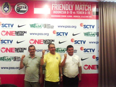 Official, Pelatih, dan Asisten Pelatih Yaman (dari kiri-kanan) dalam jumpa pers di hotel bilangan Demangan, Kamis (22/5) sore. (Foto: Swadesta)